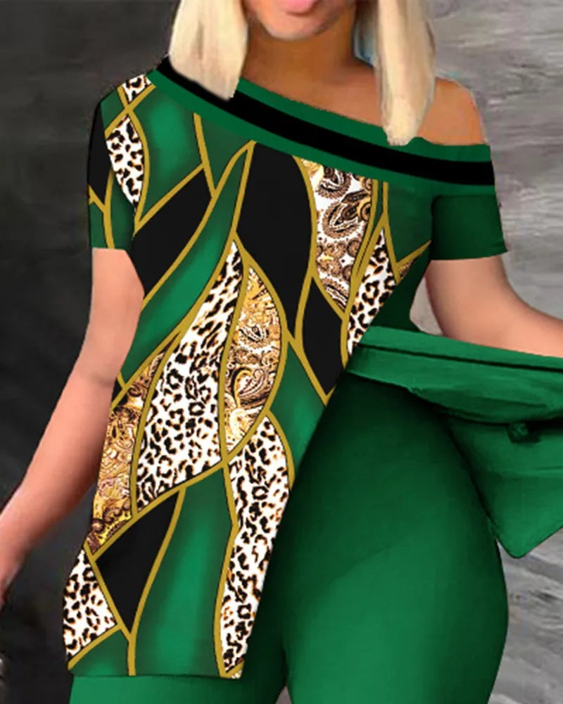 Elegant Women Two Piece Set Suits New Fashion Printed Ruffle Sleeve Top Solid Color Pants Set With Belt Blouses Female Clothing